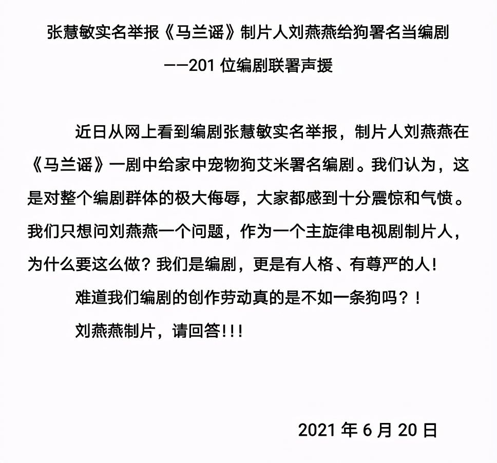 作家编剧张慧敏实名举报《马兰谣》制片人给家中宠物狗署名当编剧,得到了多位编剧的联署声援。是可忍孰不可忍。
