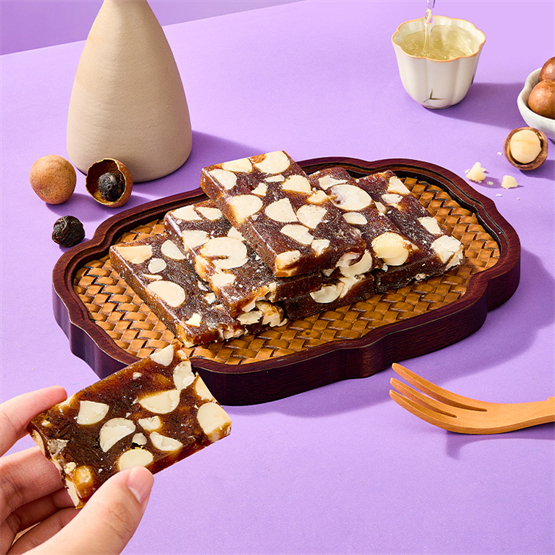 奇亚籽黑芝麻糕诚意十足,精选颗粒饱满的黑芝麻,经悉心烘烤研磨,香气得到充分释放。糕体质地油润细腻,奇亚籽的加入丰富了咀嚼的趣味,整体甜香温和,软糯不腻。贵圆糕则别出心裁,将馥郁的桂圆肉与酥脆的夏威夷果仁相结合,一口咬下,香、酥、软、糯多种口感层次分明,风味融合得恰到好处。